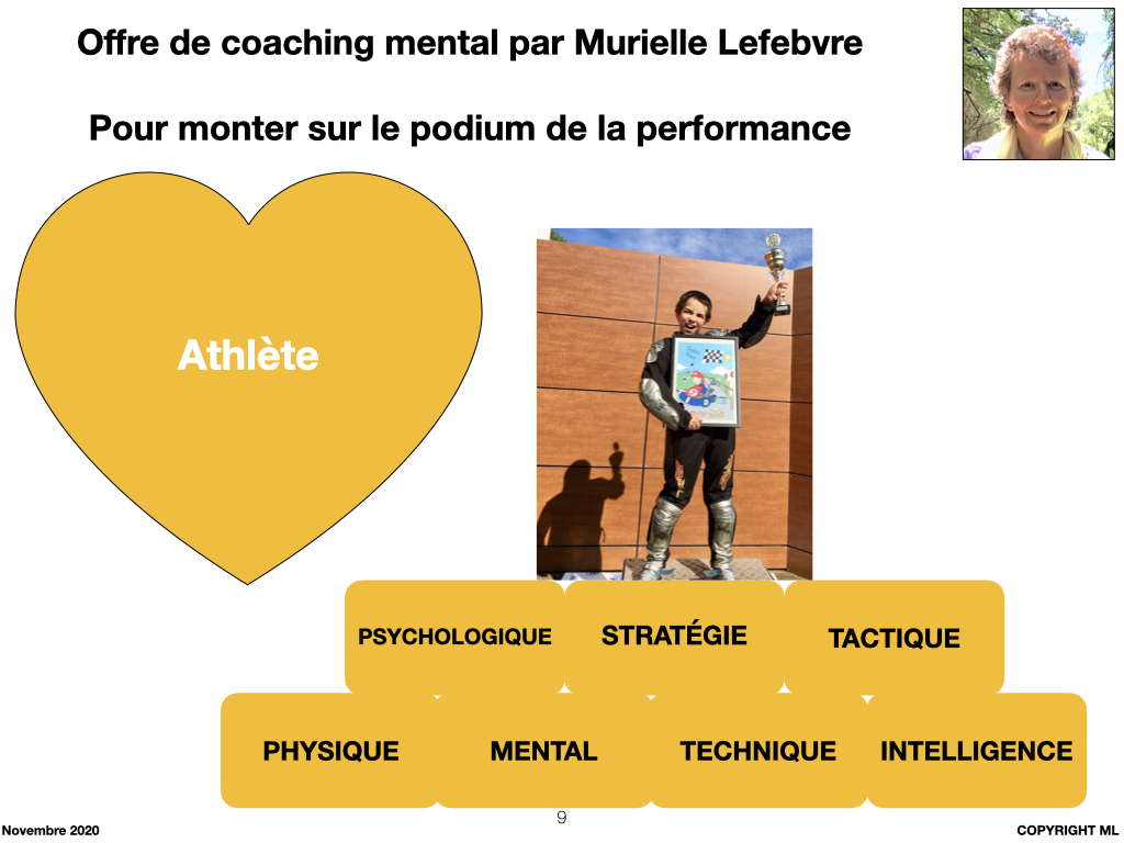 Ma méthode se nomme « Les 7 briques de la performance » pour les sportifs – ou « la tour personnelle mentale » pour les autres personnes – et propose au sportif de monter sur le podium grâce à ses 7 briques.